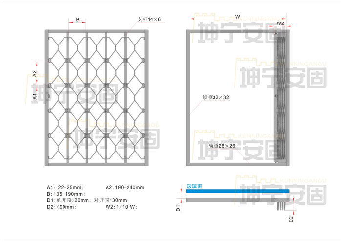 坤寧安固折疊防盜窗產品的表面處理為酸洗、磷化、鍍鋅、靜電噴塑,噴塑顏色常規4種:白色、深灰色、墨綠色、咖啡色,基本滿足了各種環境的配色需要,色彩艷麗、華貴,采用優質室外塑粉,涂層牢固不變色、強力防銹。